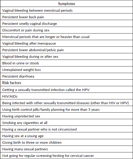 Several studies conducted among women and communities in SSA have found that the knowledge of cervical cancer symptoms and risk factors is generally poor [19–22]. Evidence suggests that awareness of cervical cancer symptoms can improve help-seeking behaviours, resulting in earlier presentation to health care facilities and, possibly, diagnosis at an earlier and more treatable stage of disease [22, 23]. With an estimated 65%–85% of cervical cancer patients in SSA being diagnosed at an advanced stage of disease, the need for improved awareness around symptoms of cervical cancer is crucial [24]. Improving awareness of certain risk factors, such as HPV infection and the importance of cervical cancer screening, is also essential [25]. In a study across SA and Uganda, less than 1% of participants mentioned either HPV infection or a lack of cervical cancer screening as risk factors for cervical cancer, with similar findings reported in a study in Libya [23, 26].