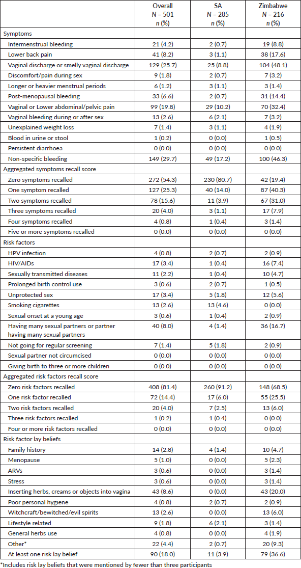 Many of the studies conducted in SSA assessing cervical cancer awareness have been conducted at a community or population level. Comparatively, little is known about the level of cervical cancer awareness among women diagnosed with cervical cancer in SSA. The aim of this study was to determine cervical cancer symptom and risk factor awareness and describe risk lay beliefs about cervical cancer among women recently diagnosed with cervical cancer in SA and Zimbabwe.