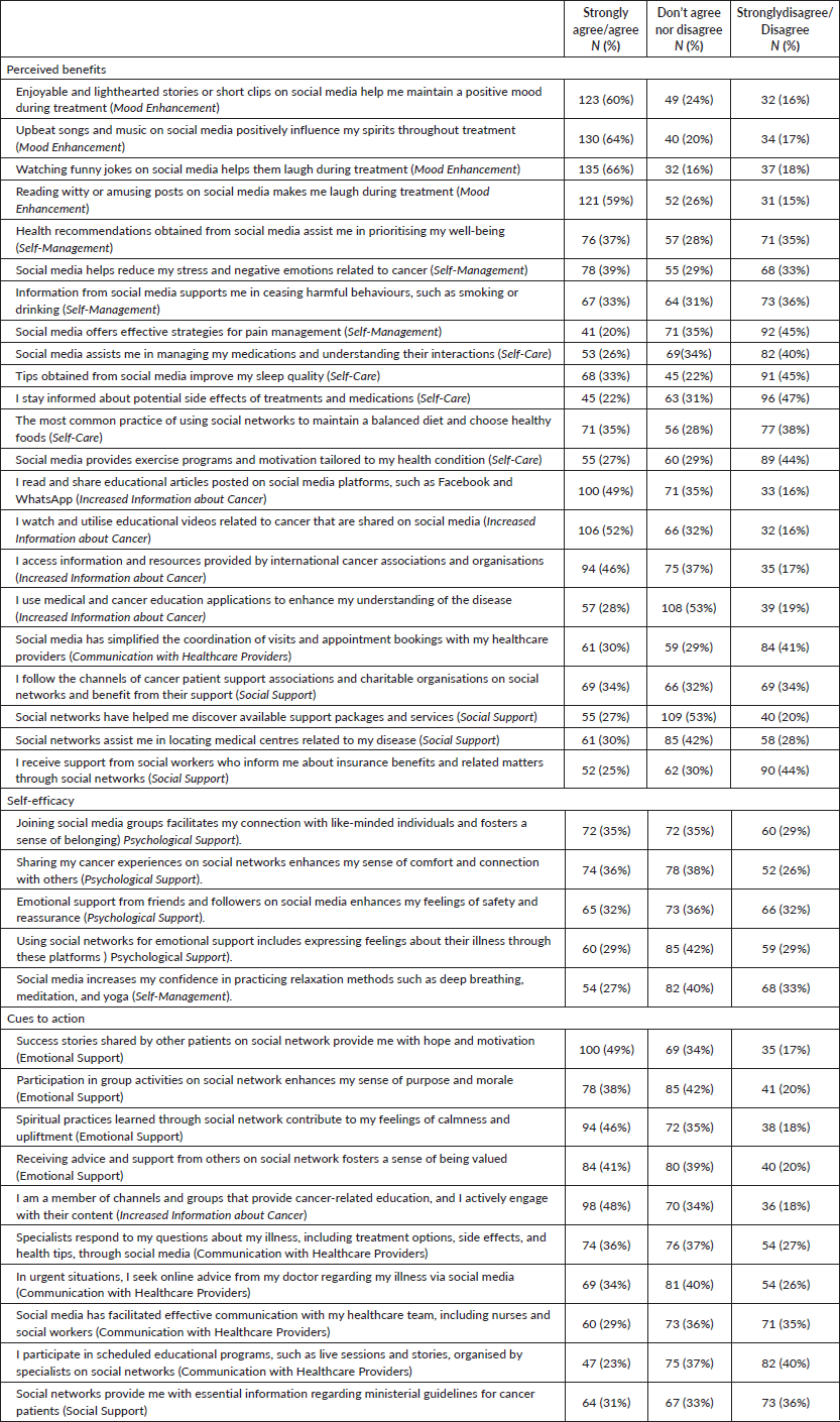 The initial design of the questionnaire focused on exploring social media usage patterns in cancer care. However, to provide a more robust theoretical framework for data interpretation, the domains were revised and adapted based on the HBM. It is important to note that this conceptual adaptation did not alter the original questionnaire items, and the questions were categorised solely according to the three domains relevant to the current study’s questionnaire. To assess the internal consistency of the revised framework, Cronbach’s alpha coefficients were calculated for each of the three HBM domains. The results demonstrated strong internal consistency across the board: Perceived benefits (22 items, α = 0.84), Cues to action (10 items, α = 0.81) and perceived self-efficacy for preventive behaviours and social media use (5 items, α = 0.75). All these coefficients exceed the widely accepted threshold of 0.70, confirming the reliability of the scales within the context of this study.