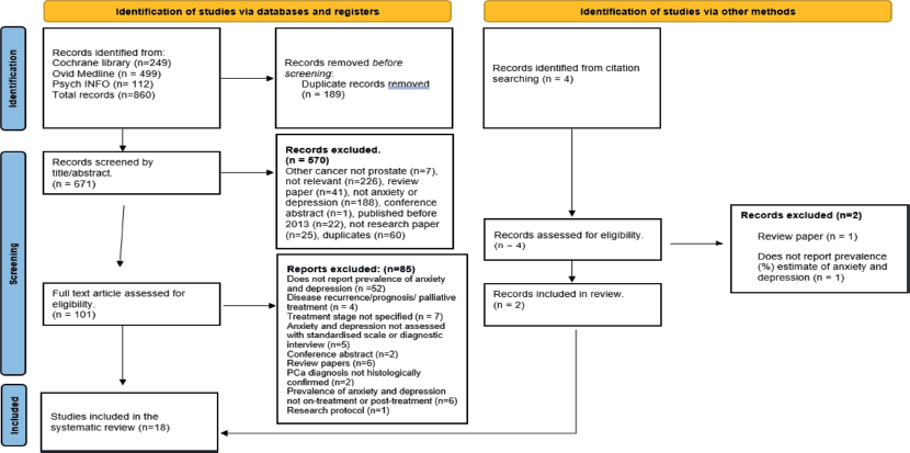 After the database search and article screening process, 18 eligible studies were included in the review. The article screening and selection process is summarised in Figure 1. The studies included in the review examined the prevalence of anxiety and/or depression in PCa patients in the on-treatment and/or post-treatment phase. The characteristics of the studies included in this review are summarised in Table 3.