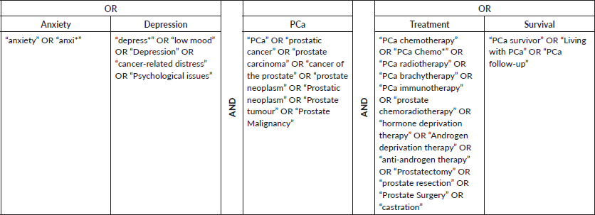 A systematic search was conducted on the Cochrane Library, APA PsycINFO and Ovid Medline to identify studies that reported the prevalence of anxiety and/or depression in individuals diagnosed with PCa across the treatment stages of the disease. The details of the search strategy are presented in Table 1. The databases were searched from 2013 to June 2023. Also, to supplement the search, the reference lists of included studies were screened to identify studies not initially retrieved from the database search.