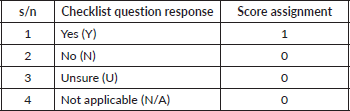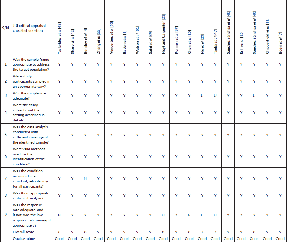 OEA and AO assessed the methodological quality of the included studies using the Joanna Briggs Institute (JBI) critical appraisal checklist [34] as summarised in Table 2. Also, a scoring system was used to rate the studies as having low, moderate or high quality based on the overall score. Similarly, where there were disagreements, they were resolved by discussing with another team member. The scoring and quality rating criteria are summarise in Supplementary Tables 1 and 2.