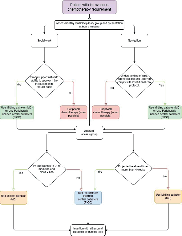 The Luis Carlos Sarmiento Angulo Cancer Treatment and Research Centre (CTIC) and its Clinical Functional Unit for leukaemia, lymphoma and myeloma (CFU-LLM) initiated operations in 2022. Following a comprehensive review of vascular access options for patients during a multidisciplinary meeting, the CTIC vascular access team (VAT) and the CFU-LLM reached a consensus that PICCs or MCs were the optimal choice for our patients. It was determined that all vascular access devices utilised should be high-flow and bilumen.