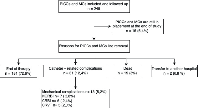 Figure 2. Flowchart of reasons for PICCs or MCs line removal. PICCs: Peripherally inserted central catheters, MCs: Midline catheters, CRBI: Catheter-related bloodstream infection, NCRBI: Non-catheter-related bloodstream infection, CRVT: Catheter-related venous thrombosis.