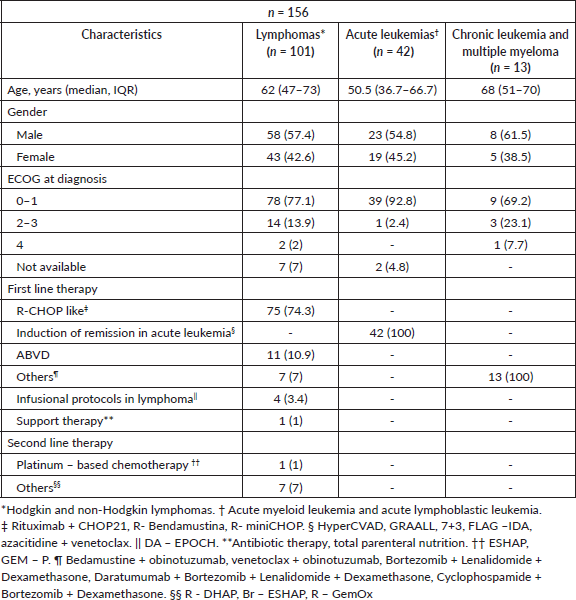 Objective: To characterise the population and describe the complications in patients with hematologic malignancies who underwent implantation of a peripherally inserted central catheter (PICC) or midline catheter (MC) for the administration of chemotherapy or oncologic support.