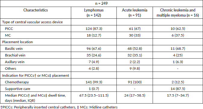 Results: 156 patients with 249 events were included. All devices were high-flow and bi-lumen, the most common indication was chemotherapy administration, and the most common site was brachial. The median days in use for lymphoma and acute leukaemia were 67.5 and 24 days, respectively. The rates of catheter-associated thrombosis and catheter-associated bloodstream infection were 3.2% and 3.7%, respectively. The rates of catheter-related venous thrombosis per 1,000 catheter days and catheter-related bloodstream infection per 1,000 catheter days were 0.31 and 0.83, respectively.