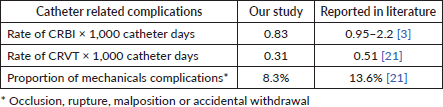 The incidence of mechanical complications and both CRBI and CRVT was less frequent compared to the reported rates in the literature. Table 3 compares our findings with global data.