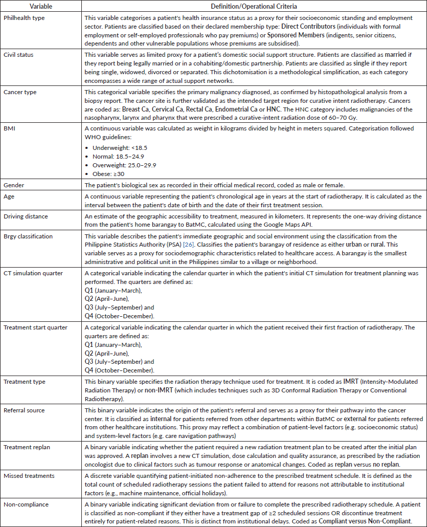 Data were retrospectively collected from multiple sources. Patient sociodemographic and clinical characteristics (e.g., age, sex and cancer type) were extracted from medical records. Treatment-specific parameters (e.g., RT technique, treatment dates and missed sessions) were retrieved from the ARIA® oncology information system (Varian Medical Systems, Palo Alto, CA). Geographical data were determined using the 2020 Philippine Statistics Authority census to classify each patient's home barangay as urban or rural [26]. The one-way driving distance from their barangay to BatMC was calculated via the Google Maps API and served as a proxy for geographic accessibility [27]. We acknowledge that driving distance does not fully capture the complexities of travel, such as public transport availability, financial costs or the impact of local weather conditions [21]. All variables, with their operational definitions, are detailed in Table 1. For the purposes of our analysis, 'clinical severity' was conceptualised as a composite measure reflecting the cumulative physical burden on the patient, encompassing cancer type, acute treatment-related toxicities and significant clinical events like the need for a treatment replan.