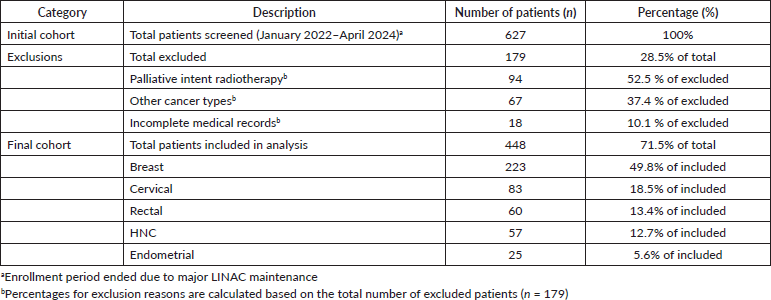 From an initial 627 patients who underwent external beam RT at BatMC between January 2022 and April 2024, 448 (71.4%) were included in the final analysis. A total of 179 records were excluded due to palliative treatment intent (n = 94), a diagnosis other than the specified cancer types (n = 67) or incomplete data (n = 18). The complete patient flowchart and distribution by cancer type are detailed in Table 2.