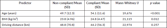 Table 4. Comparison of continuous predictors between compliant and non-compliant groups.