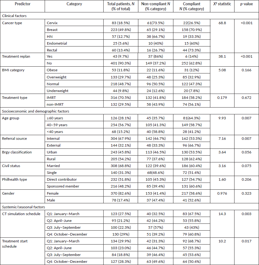 Results: The overall non-compliance rate was 42.4%. The final multivariable model revealed that non-compliance was primarily driven by a convergence of clinical and systemic factors rather than patient demographics. The strongest predictors reflected clinical severity, specifically cancer type [cervical: odds ratio (OR) = 7.43; head and neck: OR = 3.54] and the need for a treatment replan (OR = 5.60). Systemic factors were also significant predictors, including an internal referral source (OR = 1.83) and treatment timing. Specifically, the risk of non-compliance increased for patients undergoing computed tomography simulation in the third quarter (July–September) and for those starting treatment in the fourth quarter (October–December), which are periods associated with regional climatic and socioeconomic pressures.