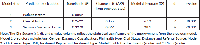Clinical factors were most prominent. Compared to patients with rectal cancer, the odds of non-compliance were over seven times higher for patients with cervical cancer odds ratio (OR = 7.43, p < 0.001) and over three times higher for HNC (OR = 3.54, p = 0.006). The need for a treatment replan was also a strong predictor, associated with over five times the odds of non-compliance (OR = 5.60, p < 0.001). Among systemic factors, patients referred internally within BatMC had 1.8 times the odds of non-compliance compared to those referred externally (OR = 1.83, p = 0.017). Finally, seasonal timing was a significant predictor. While not all individual quarters reached statistical significance against the quarter 1 (Jan–March) baseline, Likelihood Ratio Tests confirmed that the overall variables for CT Simulation Quarter (p < 0.001) and Treatment Start Quarter (p = 0.009) were significant contributors to the model (Table 9). The data revealed a clear trend of escalating risk across the year. The highest risk was associated with undergoing CT simulation in the third quarter (July–September; OR = 5.18) and starting treatment in the fourth quarter (October–December; OR = 2.03) when compared to the first quarter. Other variables, such as age, BMI and travel distance, did not remain significant predictors after adjusting for other factors.