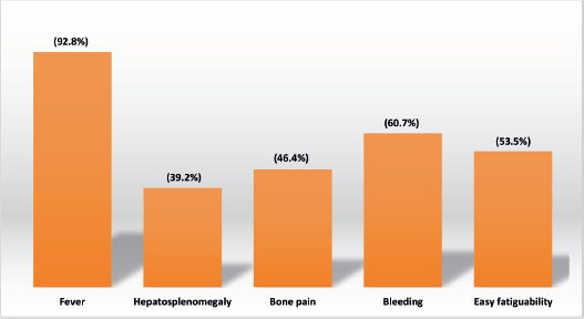 The majority of patients presented with fever (92.8%), bleeding (60.7%) and easy fatigability (53.5%).