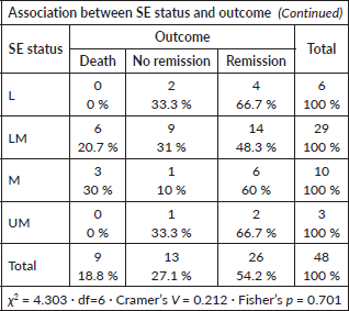 Induction outcomes comprised complete remission in 47%, no remission in 23%, induction death in 16% and treatment abandonment in 14%. Literature from both developed and developing countries shows remission rates of 56%–83% and induction mortality between 3% and 25% [16, 17, 29–42]. When patients who abandoned therapy were excluded, only ELN risk category retained a statistically significant association with outcome: high-risk patients were more likely to fail induction or die, while favourable-risk patients achieved higher remission rates. This association has been consistently reported in prior studies [30–33].