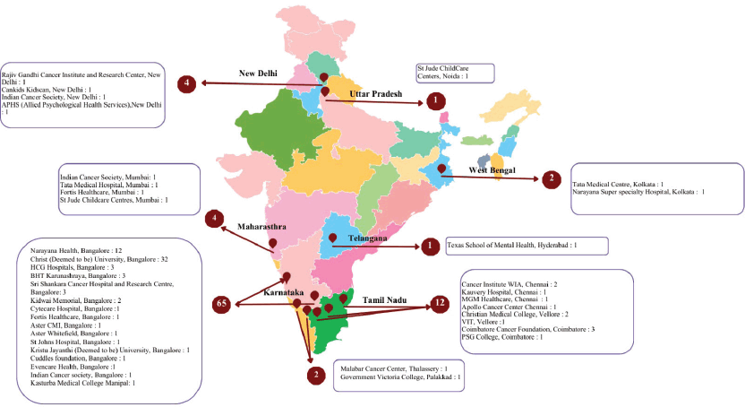 The main conference day of NAPPOCON 2025 was met with enthusiasm and participants hailing from various multidisciplinary specialties. The conference received a total of 91 registrations from professionals across the country and from various professional backgrounds, including paediatric oncologists, surgical oncologists, radiation oncologists, nutritionists, nurses, psychologists, psychiatrists, social workers, psycho oncologists and trainees. The participants consisted of 31 professionals who were already working full time in the oncology space and 60 trainees. A brief overview of the distribution as per location is depicted in Figure 1 below.