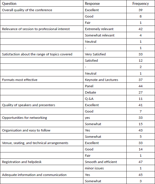 The conference ended with an interactive quiz for participants to check their learning and understanding during the day, followed by feedback on the sessions and arrangements. The feedback received from the participants for the workshop is elaborated in Table 1, while the feedback for the main conference is further elaborated in Table 2 below.