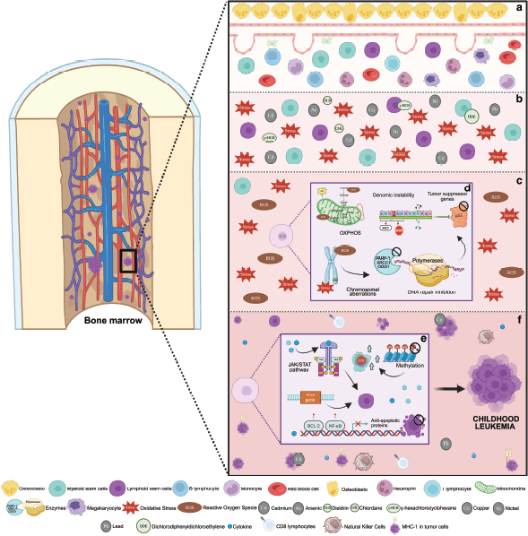 Figure 4. Molecular pathways disrupted by TM and pesticide exposure potentially linked to leukaemia. (a) Normal hematopoiesis. (b) Bone marrow contamination with TM and pesticides generating cellular stress. (c) Alteration of the microenvironment by oxidative stress with the generation of free radicals and reactive oxygen species. (d) DNA damage generating mutations in critical genes (TP53), chromosomal aberrations such as translocations and inhibition of enzymes involved in DNA repair (PARP-1, OGG1, XRCC1 and polymerases). (e) Modification of hematopoietic precursors by alteration of signaling pathways such as JAK/SAT and alteration in HOX gene expression. Interruption of cell apopotosis due to activation of BCL-2 and NF-KB. Global DNA hypomethylation activating oncogenes such as RAS. (f) Bone marrow with leukaemic clones secondary to immunosuppression and evasion of the immune response due to reduced expression of MHC-I in tumour cells [3739].