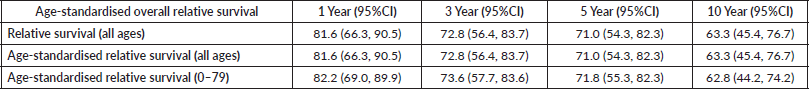 The age-standardised RS is presented in Table 2. For all age‑group and age groups of 0–79 years, the age‑standardised 5‑year RS was 71% [95% CI: 54.3–82.3] and 71.8% [95% CI: 55.3–82.3], respectively, while the 10‑year RS was 63.3% [95% CI: 45.4–76.7] and 62.8% [95% CI: 44.2–74.2], respectively. For all age groups, the 1 and 3‑year age-standardised RS was 81.6% [95% CI: 66.3–90.5] and 72.8% [95% CI: 56.4–83.7], respectively.