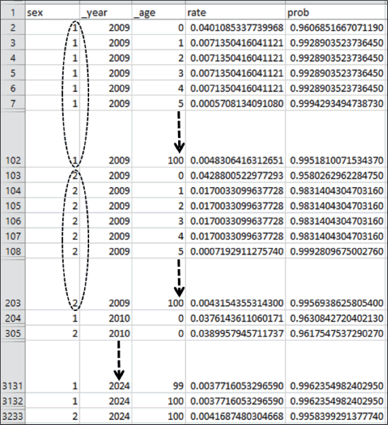 PopMort file mainly requires i) rate (General PopMort rate) and ii) probability (probability of surviving of the general population), with both variables provided in a combination of year (first incidence/occurrence year to last follow-up year of the study population), age (0–100 years) and sex (male and female) [7, 8].