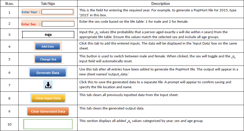 Table 1. Function and description of tabs/fields in the PopMortGen-India.