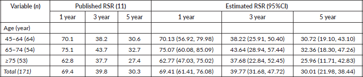 Table 2 displays the published RS Rates (RSRs) and estimated RSR, accompanied by 95% confidence intervals (CI), at 1, 3 and 5 years across various age groups. For all age cohorts (45–64, 65–74 and ≥75 years), the projected RSR practically match with the reported rates, and the published statistics remain within the respective 95% CI of the estimates. In the total population (n = 171), the reported RSR were 69.4 at 1 year, 39.8 at 3 years and 30.3 at 5 years. The calculated RSR were 69.41 (95% CI: 61.41, 76.08) at 1 year, 39.77 (95% CI: 31.68, 47.72) and 30.01 (95% CI: 21.98, 38.44) at 5 years.