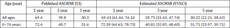 Table 3 illustrates the published and estimated age-standardised overall RS (ASRS) rates at 1, 3 and 5 years for all age groups and persons aged 0–74 years. The projected ASRS values align strongly with the reported rates across all time points. The published ASRS for the overall population was 69.4%, 39.8% and 30.3% at 1, 3 and 5 years, respectively, whereas the calculated ASRS was 69.43% (95% CI: 61.44–76.10), 39.75% (95% CI: 31.63–47.74) and 30.22% (95% CI: 22.21–38.62). Correspondingly, for the 0–74 age groupings, the reported ASRS was 72.4%, 40.7% and 31.6%, which matches closely with the estimated values of 72.39% (95% CI: 64.63–78.73), 40.81% (95% CI: 32.85–48.60) and 31.71% (95% CI: 23.97–39.71).