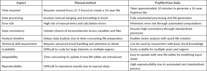Table 4. Comparison of manual methods and PopMortGen-India tool for creating PopMort files.
