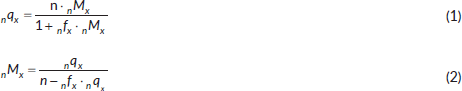 The mortality rate must be estimated from a life table. In India, the Sample Registration System (SRS) provides abridged life tables, which do not directly provide the mortality rate [9]. Abridged life table provides the nqx column [9, 10]. So the mortality rate (nMx) must be calculated by reversing the formula of calculation of nqx, as mentioned in equations 1 and 2 [10].