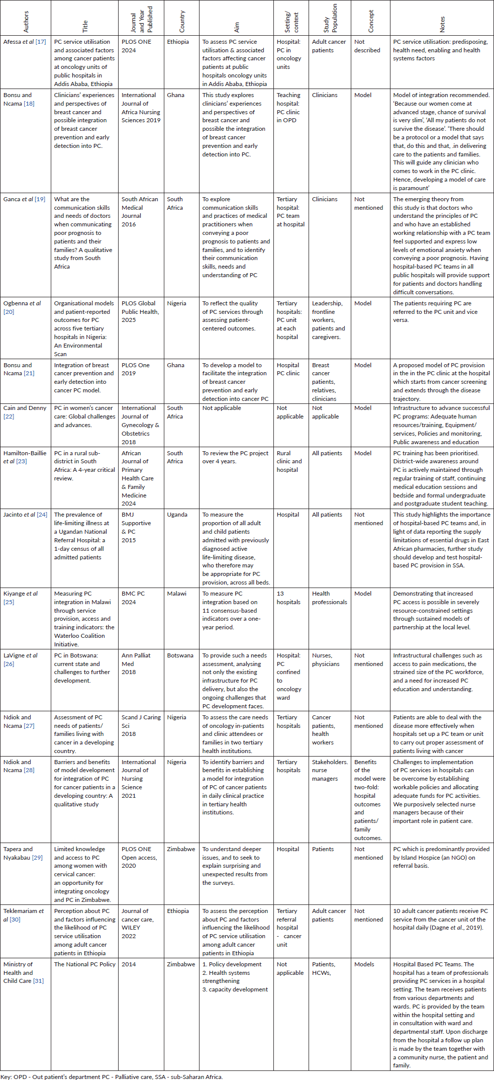 Three out of the six studies described hospitals with a PC clinic/unit, and this was reflected in the Zimbabwe PC policy. Seven of the studies did not mention model/framework but described the population and context and the context of PC provision was a PC unit [17], PC team for the hospital [19] and PC confined to oncology ward/cancer unit [26, 30].