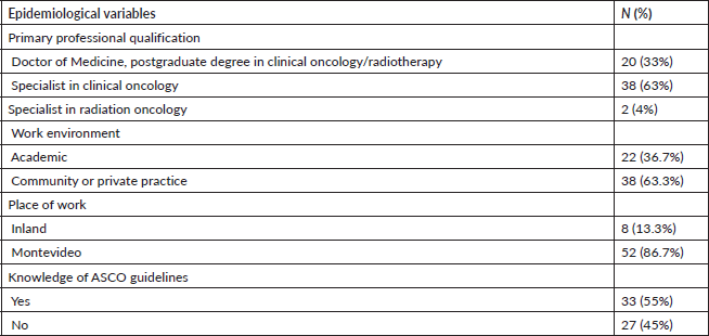 Of the 60 physicians who responded to the survey, 63% work as specialists in clinical oncology, while 4% work in radiation oncology. Thirty-three percent are physicians in training (postgraduate studies in oncology) in both specialties. 63.3% provide daily care in public or private institutions, and 86.7% practise in Montevideo. Fifty-five percent were aware of the ASCO guidelines (Table 1).