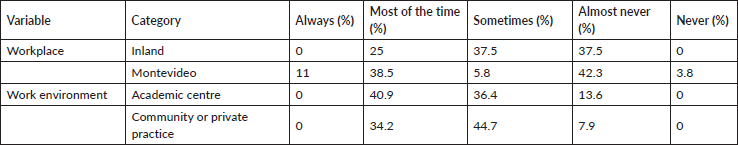 Forty-five percent of participants reported that they make decisions differently for older adults than for younger patients, while 13% indicated that they never or almost never do so. This difference varies according to the workplace: most professionals in the interior reported that they ‘almost never’ modify their approach, unlike those working in Montevideo, who do so more frequently (Table 2).
