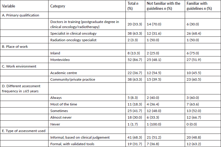 After starting treatment, professionals familiar with the guidelines continued to evaluate cognition and nutritional status more frequently, in contrast to those unfamiliar with the guidelines, for whom social support was the most frequently used domain (Table 4).