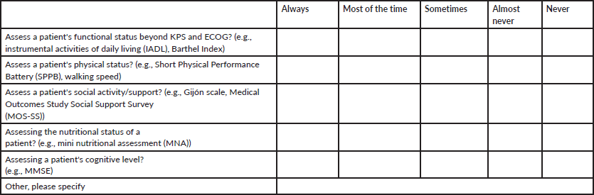 • Knowledge of the ASCO geriatric oncology guidelines (yes/no).