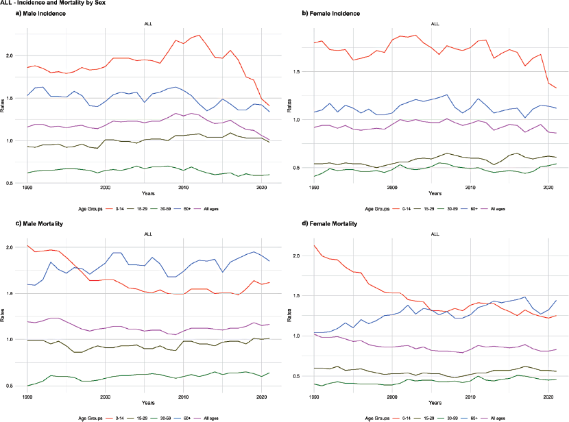 Figure 1. Age-standardised incidence and mortality rates for ALL, by age group and sex. Brazil, 1990–2021. (a) Male incidence. (b) Female incidence. (c) Male mortality. (d) Female mortality.