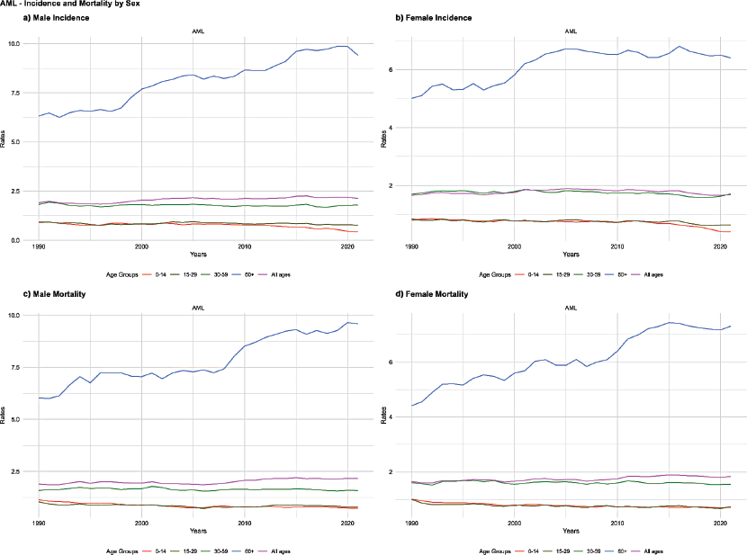 Figure 2. Age-standardised incidence and mortality rates of Acute Myeloid Leukaemia (AML) by age group and sex, Brazil, 1990–2021. (a) Male incidence. (b) Female incidence. (c) Male mortality. (d) Female mortality.