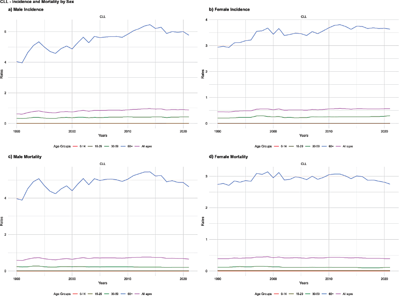 The incidence of CLL has shown an increase among adults and older adults of both sexes. Mortality, however, has shown a trend of stabilisation or slight decline across all age groups, except for older adults, where a significant increase was observed. These data suggest that improvements in CLL management and healthcare, which have extended survival, may also have contributed to the increased detection of new cases.