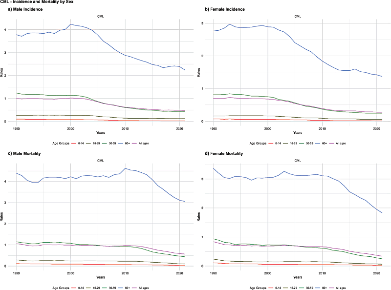 Figure 4. Age-standardised incidence and mortality rates of Chronic Myeloid Leukaemia (CML) by age group and sex, Brazil, 1990–2021. (a) Male incidence. (b) Female incidence. (c) Male mortality. (d) Female mortality.