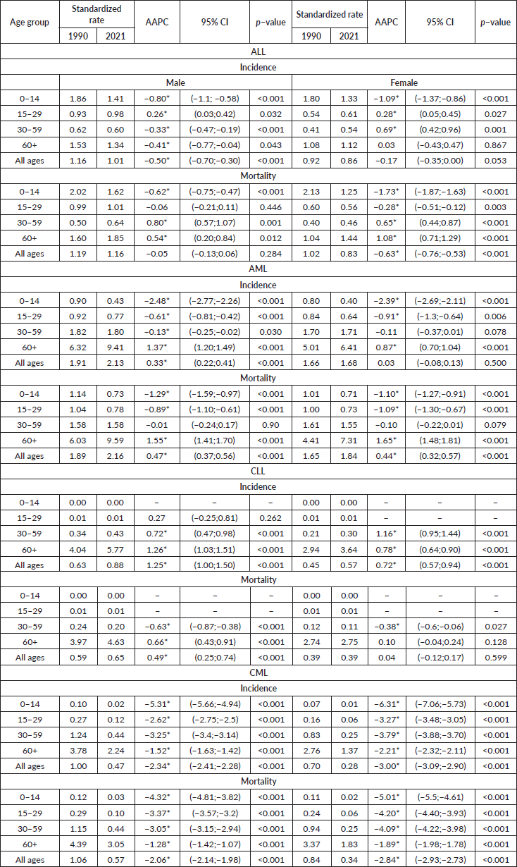 Table 1. Age−standardized rates and AAPC in incidence and mortality for ALL, AML, CLL, and CML by age group and sex. Brazil, 1990−2021.