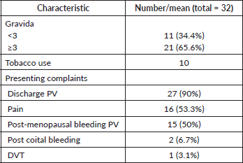 The median age at diagnosis was 51.2 years, ranging from 30 to 77 years. Most women were multiparous, 87.5% were illiterate and around one-third (31.2%) had a history of tobacco use.