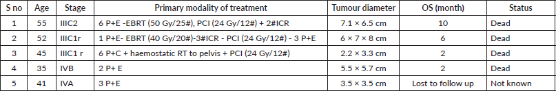 Five patients received neoadjuvant chemotherapy (NACT) as the initial treatment. These patients had locally advanced disease, ineligible for upfront curative chemoradiation or had high disease burden, including metastases. All belonged to Stage III or IV. Two patients received RT after chemotherapy, both of whom also received PCI. One patient received palliative (haemostatic) pelvic RT due to bleeding from the cervical lesion and PCI. Two patients received only NACT and one of them died within 2 months and the other was lost to follow up. Patient treatment details and outcomes are described in Table 4.
