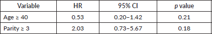 Factors showing statistical significance after univariate analysis is shown in Table 7 and after multivariate analysis is shown in Table 8. Only Parity ≥3 met the p < 0.2 threshold for multivariate inclusion. Age was also included due to clinical relevance.