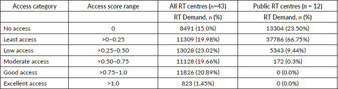 This study was designed to directly address this policy need by employing a sophisticated geospatial analysis framework. Traditional metrics, such as simple provider-to-population ratios, are insufficient because they ignore the crucial spatial dimensions of access [3, 21]. Geospatial analyses have been instrumental in quantifying barriers and access, and in informing optimal locations for new RT facilities [3, 2226]. However, most geospatial studies on RT access use travel time as the primary measure, which fails to account for the relationship between the capacity of existing centres and the potential demand [3, 18, 2225]. In an LMIC setting with limited capacity and high demand, travel time alone does not fully capture the extent of the problem. Furthermore, existing studies do not differentiate between public and private RT services. This distinction is vital for understanding access for economically disadvantaged patients who cannot afford out-of-pocket costs.