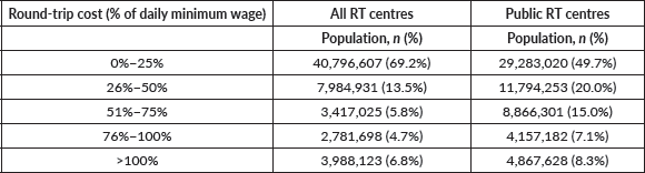 The travel-cost-to-wage ratio quantified the economic impact of this travel (Figure 6 and Table 5). For access to the nearest public facility, over 50% of the population lived in municipalities where a single round-trip costs more than 25% of the local daily minimum wage. Most critically, for 159 towns, home to nearly 4.9 million people, a single round-trip journey to the nearest public RT centre was estimated to cost more than a full day’s wages. This level of financial burden transforms a geographic barrier into an effectively insurmountable economic one, rendering treatment practically inaccessible for the working poor.