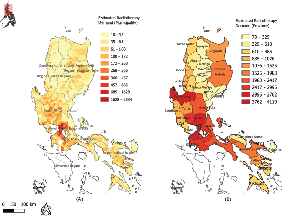 Figure 2. Estimated annual RT demand in Luzon. The maps illustrate the estimated annual number of new cancer patients requiring RT at the (a): municipal level and (b): provincial level. Darker shades of red indicate a higher concentration of demand. The highest demand is concentrated in the densely populated municipalities of the NCR, CALABARZON (Region IV-A) and Central Luzon (Region III).