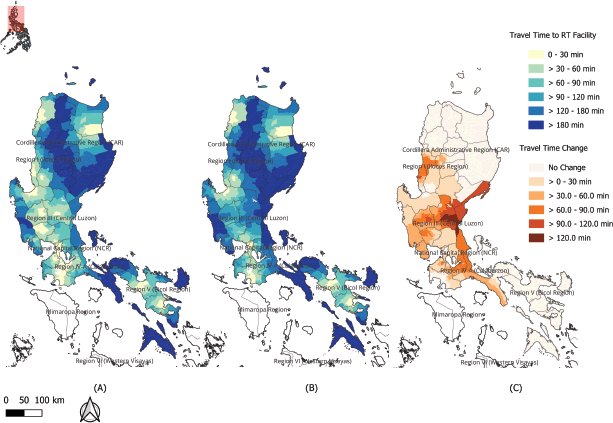 This study lays the groundwork for several critical avenues of future research. An immediate priority is to expand this analysis to the Visayas and Mindanao regions, which will require developing more complex, multi-modal travel network models to accurately capture inter-island travel. Second, the quantitative findings of this study should be complemented by qualitative research. In-depth interviews and focus group discussions with patients, caregivers and healthcare providers within the identified RT deserts would provide invaluable insights into the lived experiences of access barriers and help shape more culturally and contextually appropriate interventions. Finally, the analytical framework established in this study extends beyond descriptive analysis to serve as a powerful predictive tool for policy planning. By modelling the placement of a new public RT centre in a RT desert such as Cagayan Valley, the framework can quantify the projected increase in the E2SFCA score for surrounding municipalities and the reduction in the population facing prohibitive travel burdens. Such scenario modelling would allow the Department of Health to compare the impacts of different investment strategies and optimise the placement of new facilities to maximise impact and ensure the goals of the NICCA and UHC laws are met efficiently.