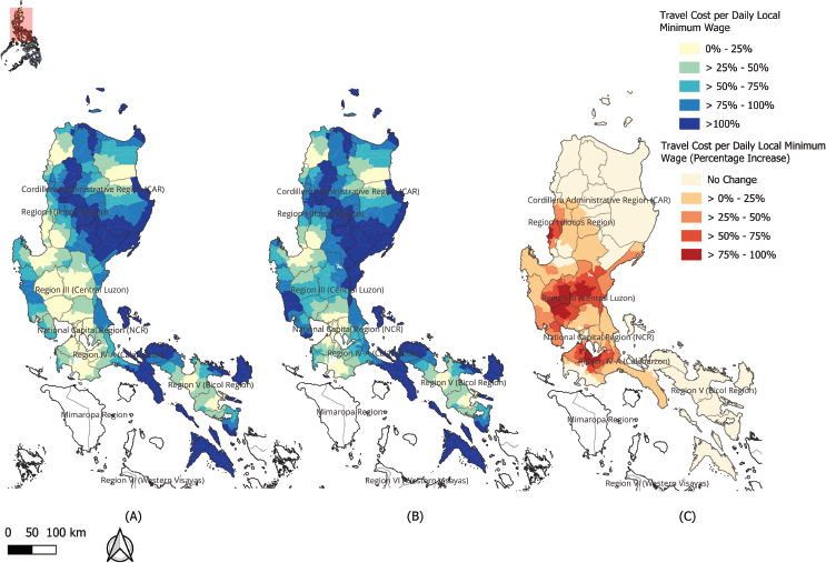 To quantify the economic friction of travel, we developed a novel metric: the travel-cost-to-wage ratio. For each municipality, the round-trip cost to the nearest RT facility was estimated using the 2023 national fare matrices from the Land Transportation Franchising and Regulatory Board [42]. This calculation was based on jeepney fares for distances of 50 km or less and on bus fares for longer trips. The estimated round-trip cost was then divided by the official local daily minimum wage for that municipality, as stipulated by the respective Regional Tripartite Wages and Productivity Boards [43]. This quantity creates a standardised measure of financial burden relative to local earning capacity. It is important to note that this metric is only a conservative estimate of the actual economic burden of daily radiation treatment. This ratio accounts only for the direct transport fares using standard public transportation. It does not include other significant out-of-pocket expenses, such as food, lodging, lost productivity or the costs associated with an accompanying caregiver.