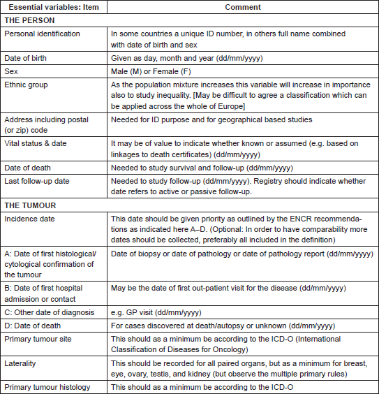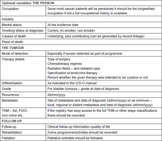 The sources of data on cancer cases usually include: treatment and diagnostic facilities (oncology centres or hospital departments, pathology laboratories, or imaging facilities etc.) and the official territorial death registry. Additional data sources like ambulatory and private clinics, elderly care homes and general practitioners networks increase the completeness of data, but also the logistics and expenses. The extent of available resources and the quality of data transfer between medical facilities and CRs dictate the choice of active versus passive ways of data collection [3, 56]. Similarly, the set of data that each CR collects depends on the quality of medical records sources and on the resources that CRs can deploy for collection. A balance needs to be maintained between the number of variables collected and the ability to ensure the completeness and validity of data [3, 6, 8, 16, 17]. The minimum set of data recommended to be collected by all PCRs was formulated by the International Agency for Research on Cancer (IARC) [6] and by the European Network of Cancer Registries (ENCR) (Table 1) [16]. Additional data (Table 2) [16] should be collected when possible, thereby increasing CRs role in broader domains of research [5, 6].