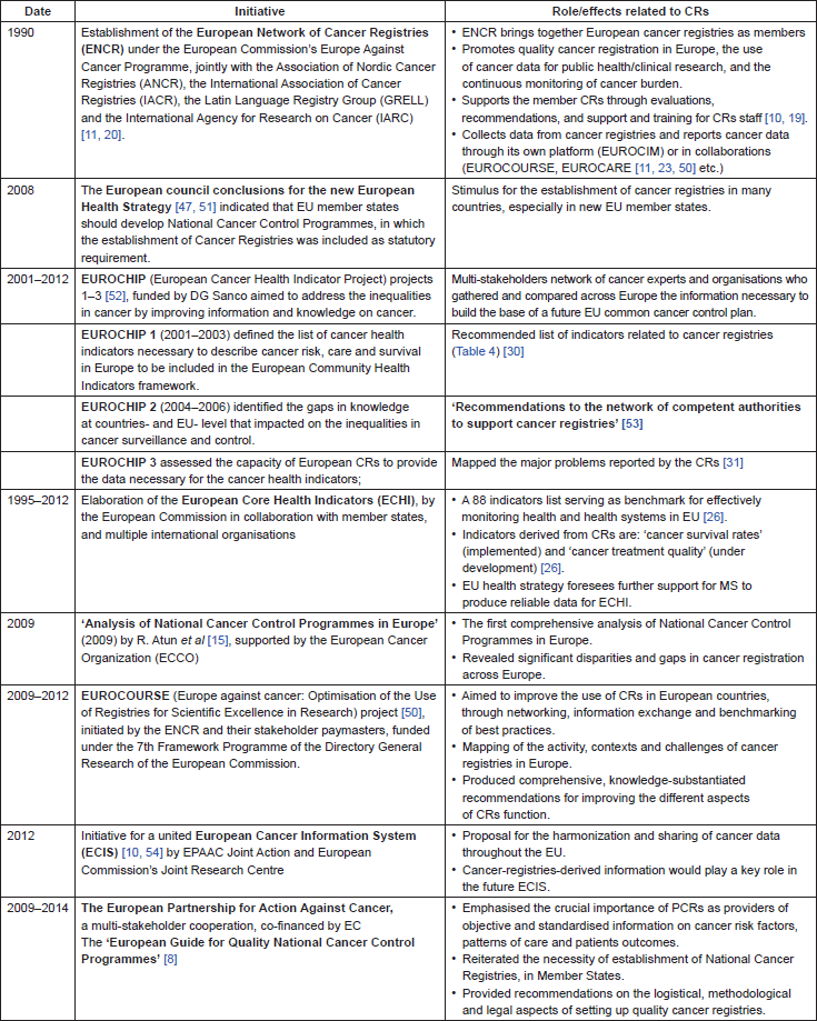 CRs have been expanding in Europe since the early 1900’s. Over the last three decades cancer registration has become an important element of the EU’s strategy against cancer, promoted within the framework of the European Action against Cancer Programme (1985–2008), the European Partnership for Action Against Cancer (EPAAC) (2009–2014) [18], and currently under the EU Cancer Control Joint Action (CANCON) [19]. While cancer has become the second cause of death in Europe, the EU endeavours to achieve pan-European standards in controlling cancer and reducing the tumour burden. Towards this aim, several major steps have been taken at the policy and funding levels to promote CRs development (Table 3).