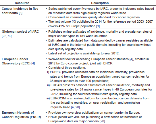 Information fragmentation. Efficient pan-European cancer registration and cancer burden analysis is hampered by the fragmentation, dispersion, and redundancy of available information. CRs report data on multiple platforms at regional, national, and international level. While several platforms supported by ENCR or IARC present centralised data from most EU countries with efforts of standardisation (Table 5), some CRs only report through regional or national reports in the national language, with variable delays, and with no peer-reviewed publication. The high-resolution studies using European CRs data publish their results in different scientific journals, with different levels of public access restriction (Table 6). Besides the CRs data, the relevant statistics for cancer control, from population statistics to healthcare systems indicators are reported fragmented across multiple databases like Eurostat and OECD, EUROCOURSE, and ECO, ENCR, EUROCHIP and ECHIS, along with the research projects repositories. The mapping efforts as well as the resulting guidelines and recommendations related to CRs function are reported dispersedly across the websites and data repositories of different EU institutions, programmes, and projects (Table 3).