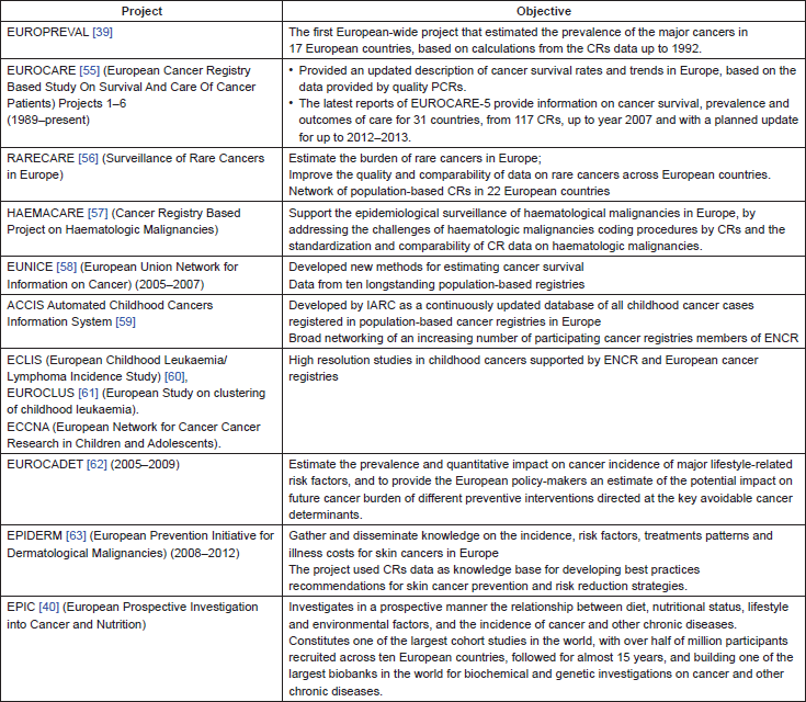 Additionally, a large number of high resolution studies collected and compiled the data from European CRs, to investigate specific aspects of the cancer burden, outcomes or risk factors in Europe (Table 6). These network collaborations faced the challenge of disparities in the quality and availability of data across the continent. Nonetheless, they produced essential information on the cancer epidemic in Europe, published in high-impact scientific journals. They highlighted the value of CRs for a wide range of research fields including health economics, patients’ quality of life and reported outcomes, patterns and outcome of care, rare diseases, oncogenesis, prevention, treatment safety or biomarkers.